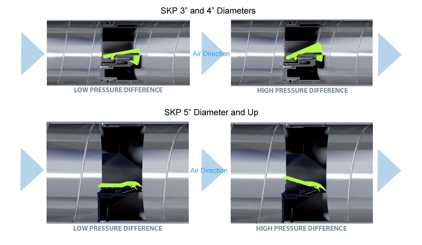 SKP-LP are self-adjustable dampers. They can be preset by the installer to maintain a specific air volume in cfm or m3/h, by mean of a screw. The damper will then auto-adjust itself to maintain the desired volume of air while performing within the pressure range. The damper is operated by an opposed opening force from a spring on the blade.